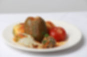served on a bed of rice topped with avgolemono sauce